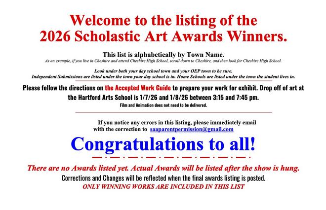 All the artwork listed in the winners list has received either an Honorable Mention, Silver Key, or Gold Key Award and will included in the CT Regional Scholastic Art Awards Exhibition. Please follow the directions below and on the Accepted Work Guidelines Page when preparing your work for the exhibit and dropping it off to the Hartford Art School.